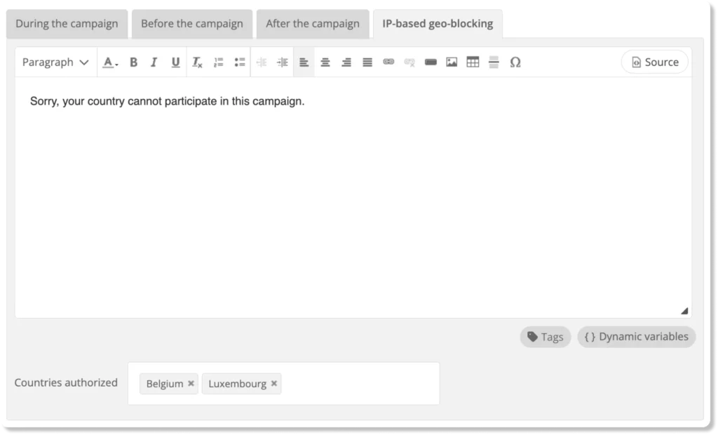 💡 Did you know you can restrict participation only to users from certain countries? With Qualifio’s IP-based geo-blocking feature (part of the Campaign Shield add-on), you can allow participants into your contest when their IP address shows they’re based in one of your target countries.