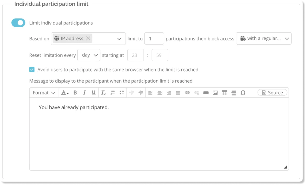 Participation limits help you manage traffic, reduce fraud attempts and protect your prizes from being taken by bots or cheating participants ⛔️