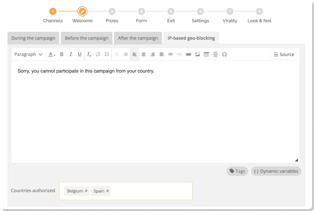 With IP-based geo-blocking, you can add one extra layer of security to prevent that. Identify each participant’s location via their IP address, define which countries are eligible, and display a custom message for those who aren’t.
